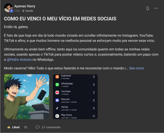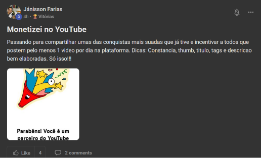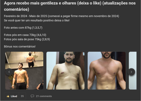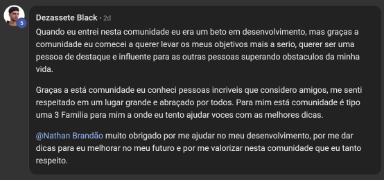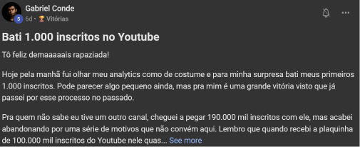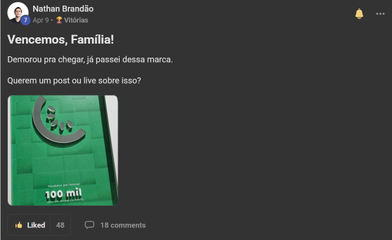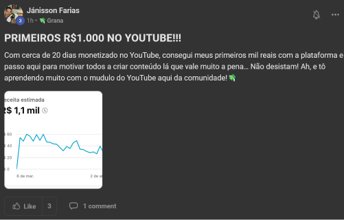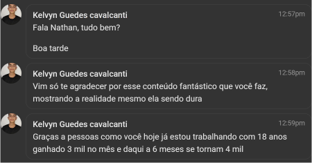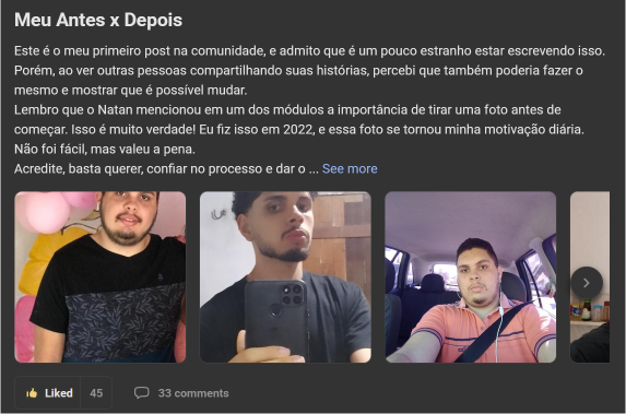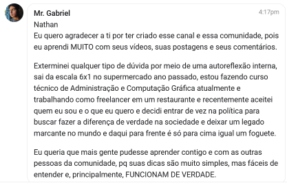 Você terá acesso a uma área de membros exclusiva, com posts de vídeo, texto, feitos por pessoas com os mesmos interesses e propósito que você, sem falar os feitos pelo Nathan. Além disso, você terá acesso a mais de 200 aulas gravadas de temas como youtube, masculinidade, testosterona, entre outros. Você também terá acesso às lives semanais com o Nathan, podendo ter um contato direto com ele.